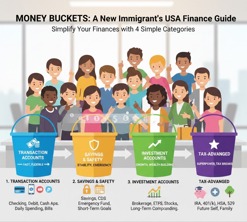 It gets confusing. This blog post is to help new immigrants to the USA make sense of the accounts here. Instead of discussing each specific account separately, I like to categorize them into four categories to make it easier to handle. You’ll need one or more accounts in each category depending on your stage in life.